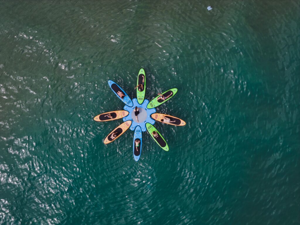 Piattaforma yoga galleggiante in PVC, ideale per attività di gruppo e scuole SUP.