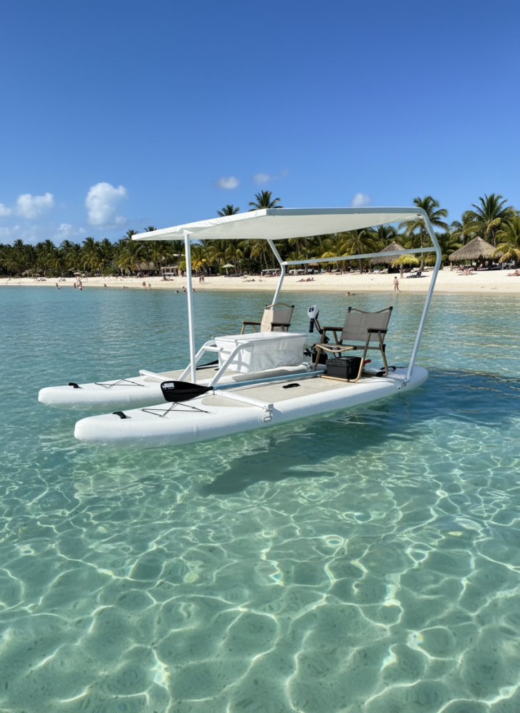 Catamarano elettrico ideale per laghi, fiumi e tratti di mare con acque calme. Facilissimo da montare, stabile e perfetto per attività turistiche e ricreative.